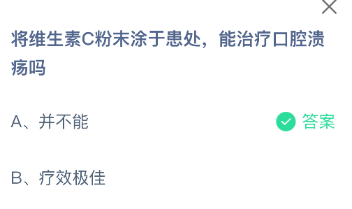 以上就是将维生素C粉末涂于患处,能治疗口腔溃疡吗,支付宝蚂蚁庄园2025年10月16日答案最新,更多精彩内容,请点击关注3DM手游网更新!