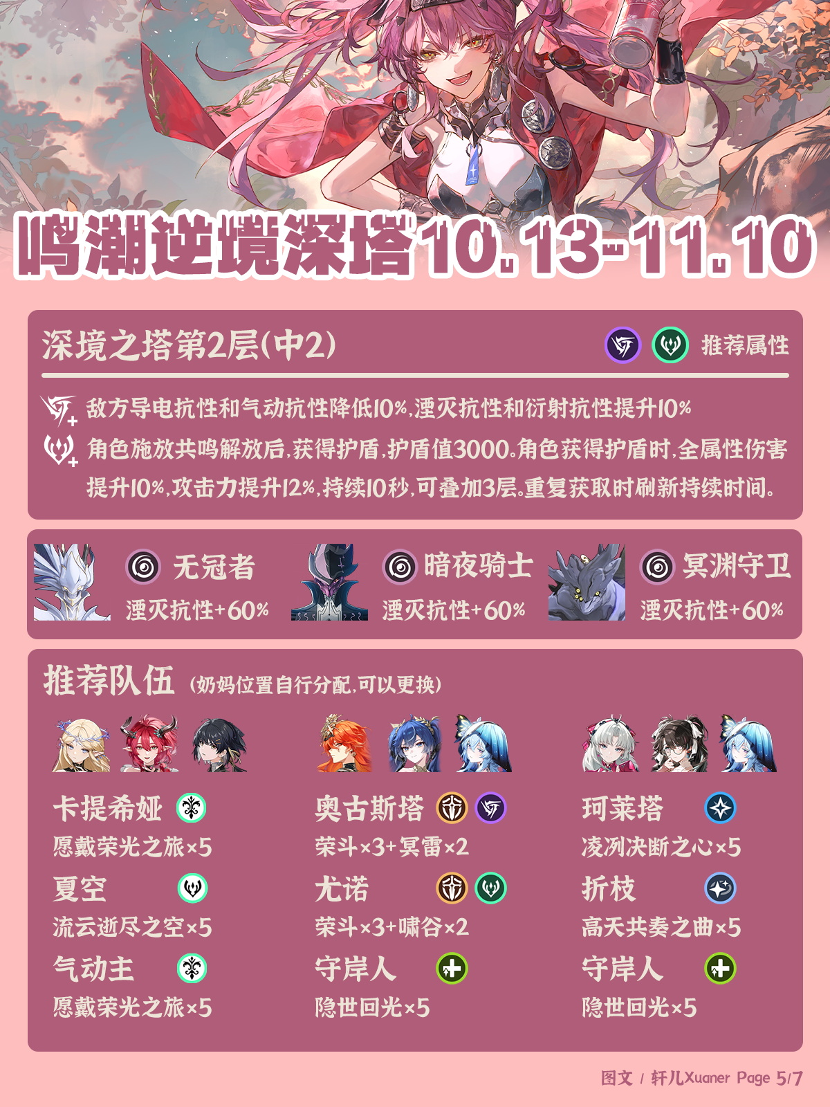 鸣潮最新深塔推荐阵容一览,玩家“轩儿Xuaner”的鸣潮最新深塔推荐阵容出炉,日月、卡提、弗坎仍是主力,赞菲可出场,嘉贝莉娜需等仇远。有需要的玩家可自行查看参考。