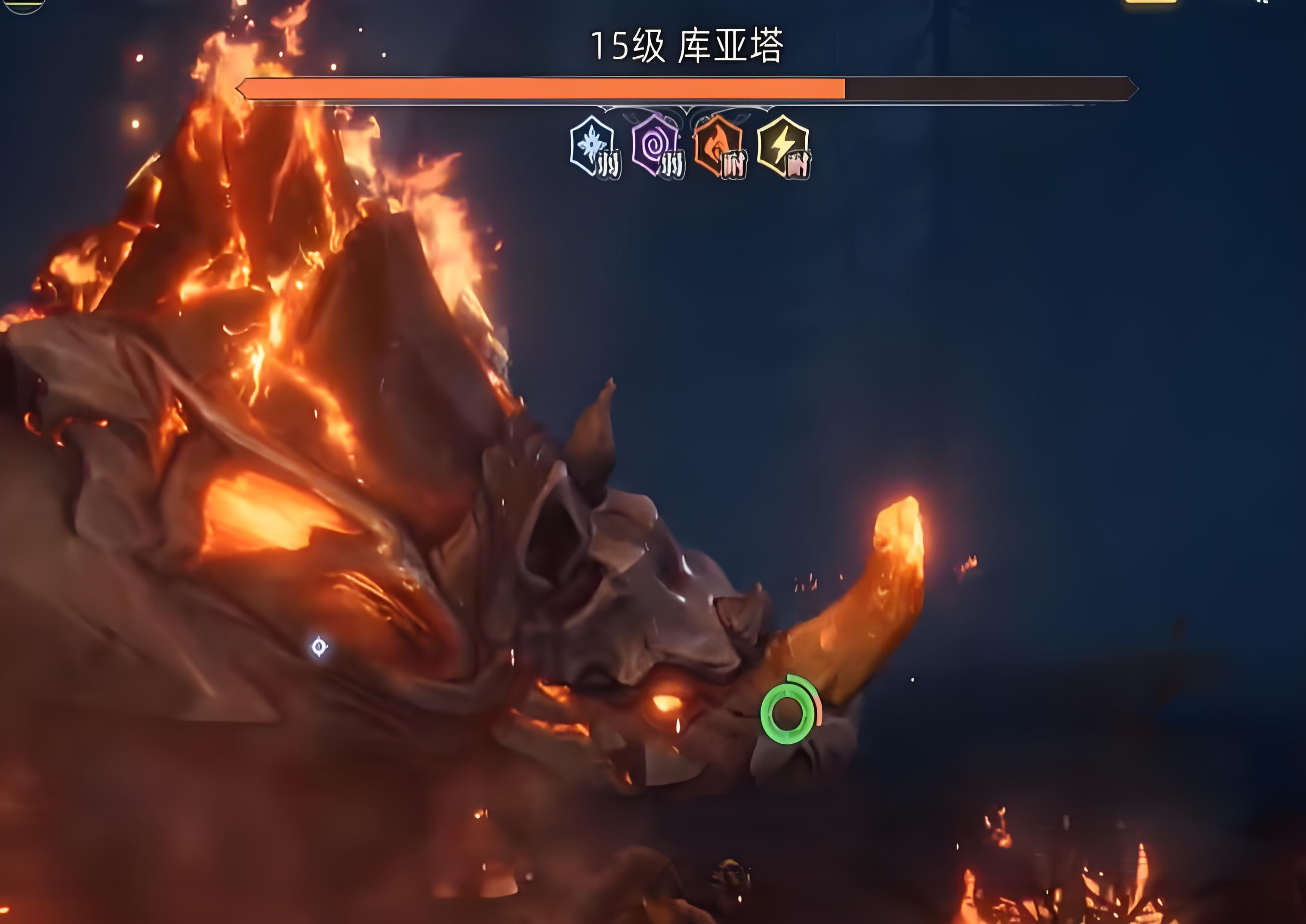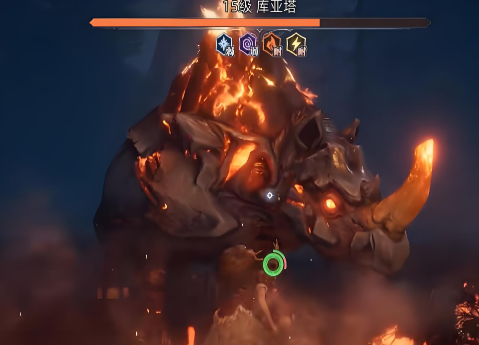 冲撞是库亚塔的基础攻击招式,若是玩家正好直面库亚塔的话,那它就会直接向着玩家所在方向发起猛烈的冲击,在停止冲击的时,还会用自身的火焰对玩家进行火属性的攻击,应对冲撞技能最好的方法就是不要和它正面对抗,而是绕到它的身后去攻击。