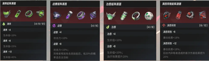 在进行配套中,我们需要知道一玩家们一共可以有15种矩阵的套装效果,攻势矩阵源器主要增加攻击力在输出方面非常有优势;涌泉矩阵源器主要是以增加生命值为主,而战意矩阵源器不仅可以增加攻击力,还有着额外的追击效果;治愈矩阵源器主要以增加生命值为主,并且还可以提升角色本身的治疗效果;洞悉穿刺矩阵源器则是增加暴击伤害。