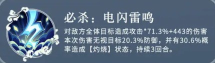 <提升【电闪雷鸣】效果>技能基础伤害提高20.6%。每减少1个技能目标,技能伤害提高7.7%。对暴击的目标,造成【灼烧】状态的概率提高25%。造成【灼烧】状态时有30%概率驱散目标增益状态。