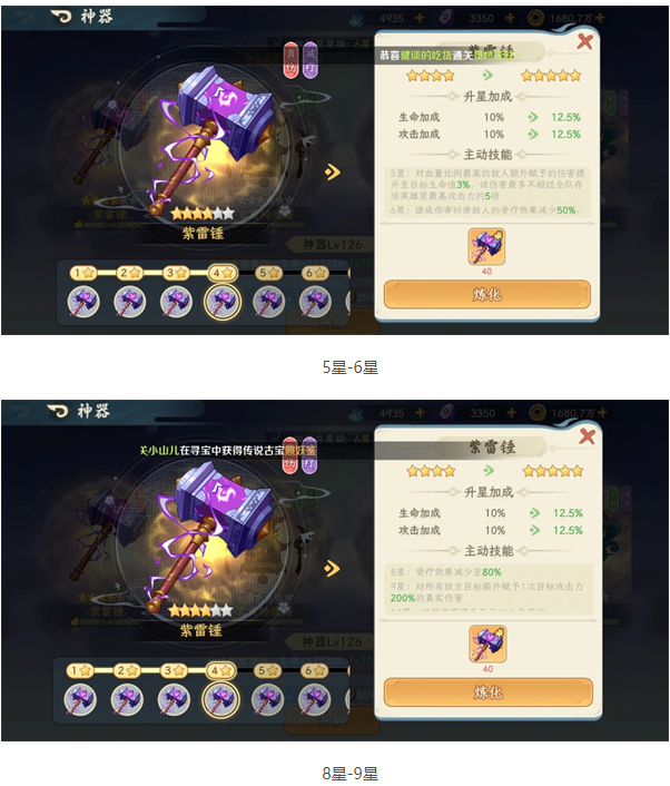 3、神器紫雷锤可谓是开荒神器,boss也要被砸的头发昏。性价比最高的是5星(下个提升pve伤害的星级高达9星)