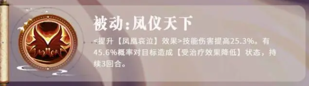 张春华的第三个技能是一个被动技能,叫做万凰之王,使用这个技能的时候,一般是在回合结束的时候可以触发,其中有60%的概率会对其中的一个敌人进行释放输出,这里的输出是根据他生命上限的13%,加上攻击的33%,再加上固定的1003的生命值进行输出,并且在此时她还会给队友恢复一点怒气数值,自身每损失10%生命的时候,他的触发概率就会有所提升,一次提升就达到了7.5%,而在她生命数值低于65%的情况下,他这里的恢复目标数值会加1个,也就是说此时会给两个队友都带来足够的恢复量。