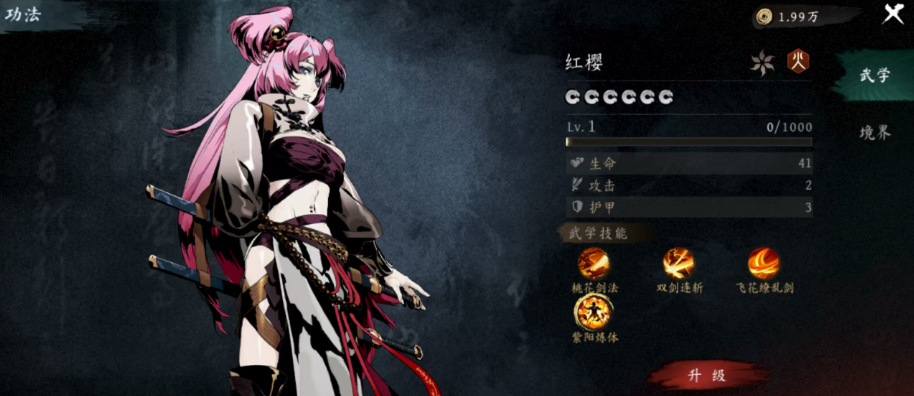 接下来再给大家介绍一个英雄叫做红樱,这个角色在使用一些剑法的时候可以带来很强的效果,她在使用武器的时候造成的攻击能力是最强的,在命中敌人之后还可以造成3次10%的伤害效果,这里如果使用双剑作为武器的话,她的战斗力是最强的,而且只要是攻击目标达到连续5次命中的话,这里就可以额外再次打来一个缭乱斩的技能,这个技能对于命中敌人来说是可以再次触发一次攻击的能力,而飞花缭乱剑这个技能,是让她的缭乱斩造成的伤害可以提升50%的数值,所以她后期的炼体之后带来的攻击能力会更高一些,但是同时她在生命下降的数值上面也会更高一些。