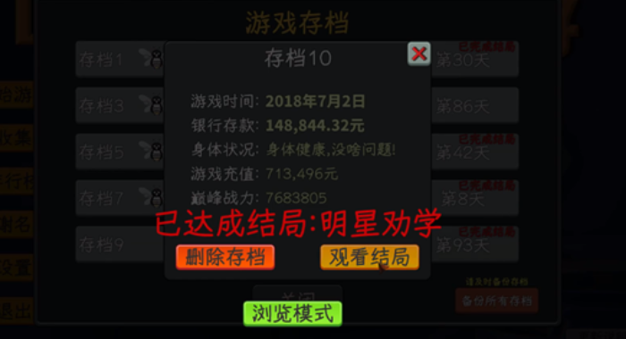 在游戏里会有各种不同的结局,每一个结局的走向都跟玩家在游戏里做出的选择相关,假如想要达成明星劝学的结局,首先玩家需要在游戏里不断参与网游的氪金,通过氪金玩家会把家产车辆全都变卖,接着还会向其他的成员借钱,要把这些获得的资金全都充值到游戏里,接着就可以进入到网游里面进行城主战的讨伐,一旦讨伐失败之后,就可以触发明星劝学的结局,这时候游戏就会结束,玩家可以继续挑战,开启新的结局。