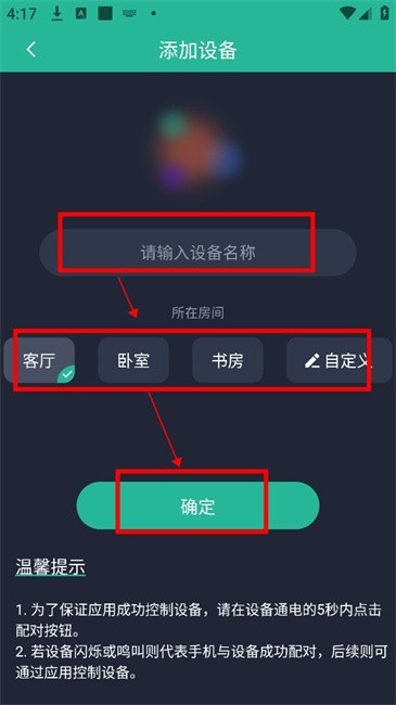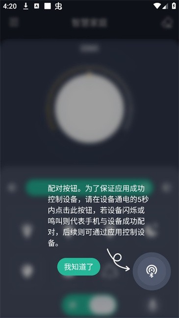 为了保证app能够成功控制设备,请在设备通电的5秒内点击此按钮,若设备闪烁或鸣叫则代表手机与设备成功配对,后续则可通过应用控制设备