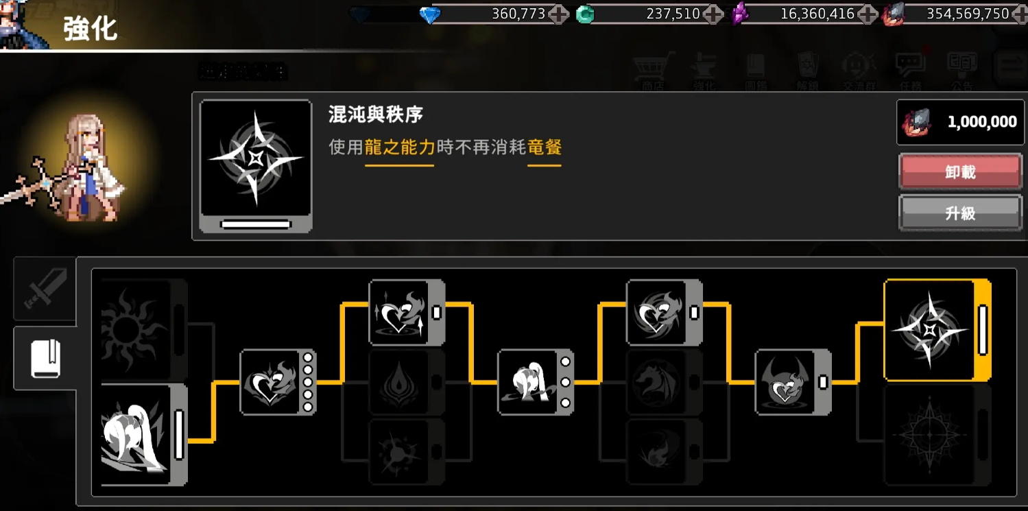 在战斗的加点方面,建议玩家直接选用混沌与秩序,该技能效果是,当龙人使用龙之能力时,不再需要消耗任何的龙餐,这可以使得龙人一直进入到龙化状态,保证输出收益。