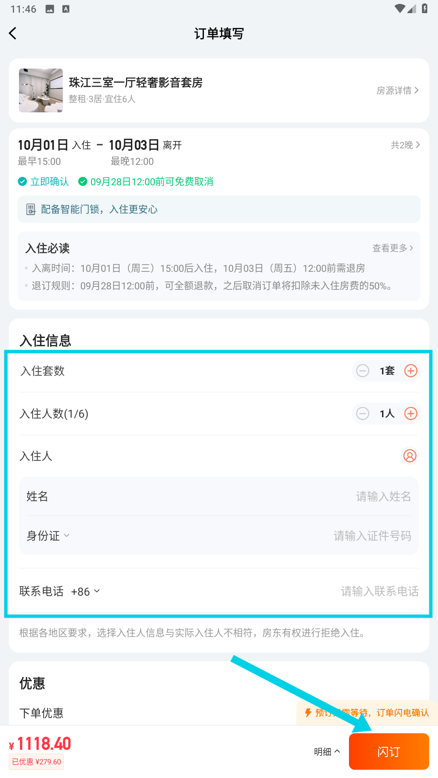 4、最后在订单填写页面,填好入住套数、人数和个人信息等,再点击【闪订】,就能完成预订啦。