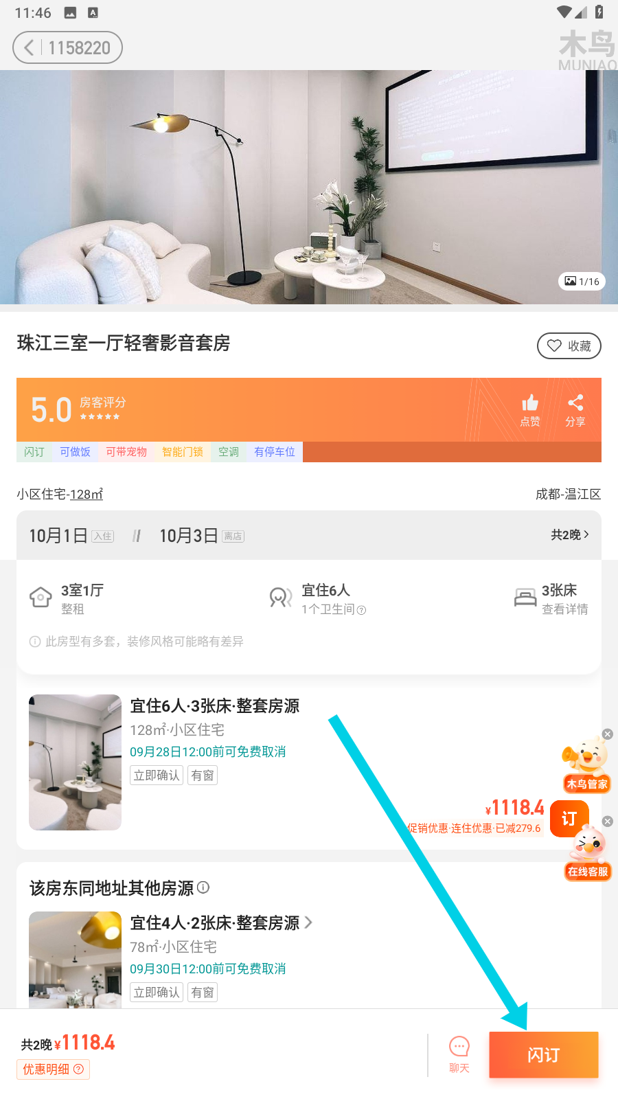3、进入房源详情页后,确认好房源信息,要是觉得合适,就点击右下角的【闪订】按钮吧。