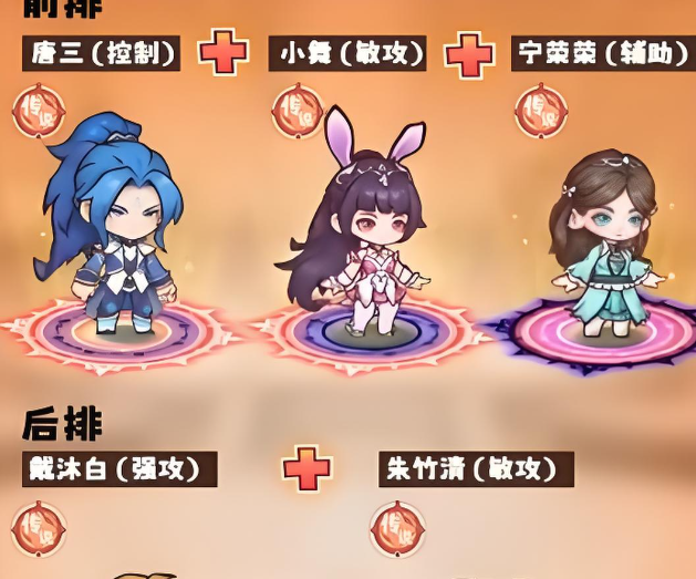 第一套阵容由戴沐白(前排)、唐三(控制)、小舞与朱竹清(双单体爆发)、宁荣荣(辅助)组成。该阵容通过唐三控制与戴沐白承伤,为双输出创造集火秒杀的环境,组建相对容易,前期推图效率高。