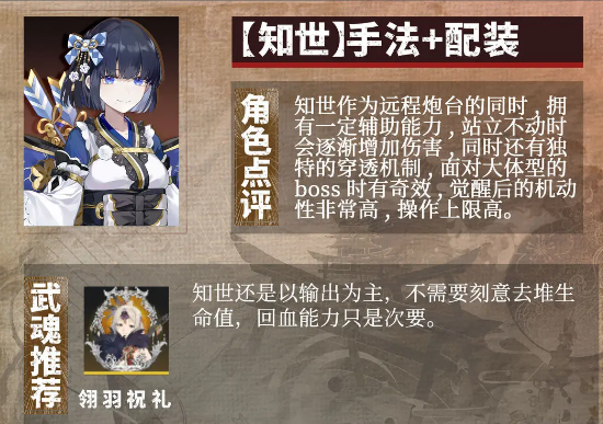 知世站着不动的时候,伤害也会慢慢的叠加。在面对大型boss时,还会拥有一个独特的穿透机制,输出效率就会直接拉满。在武魂这一方面,大家首先就应该明白这个角色就是输出的定位,在选择武魂时没有必要选择去堆生命值。回血能力是次要的,只有选择把输出属性拉满,这才是比较重要的,因此建议大家在挑选武魂时直接挑选翎羽祝礼,在选择之后就可以有效提升伤害数值。
