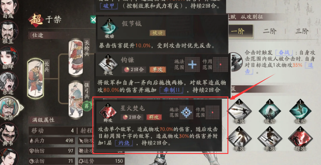 于禁大招效果“星火焚屯”,冷却时间两个回合,属于群攻技,可以攻击单个的敌方目标,同时造成物理攻击70%的伤害,随后伤害会扩散,对周围十字目标的所有敌方军队,造成基于自身物理攻击30%的伤害。
