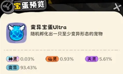 6、宝蛋分为三种,正常宝蛋是显示什么形态只能开到什么形态的宠物。宝蛋Pro为当前冒险关卡的宝蛋,21之后可以开出天灵,31之后可以开出仙灵,51之后可以开出神灵。宝蛋Ultra为冒险80关宝蛋,一般只能充值获取。