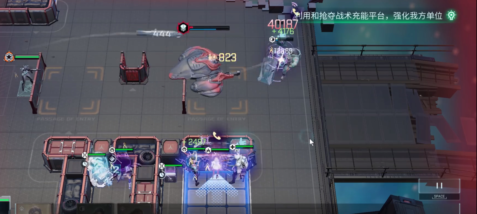 在0到30秒的初始部署阶段,我们可以优先折跃海洛到boss的侧前方2格,再对boss发动嘲讽让boss朝向固定,利用掩体挡下正面AOE。然后再将8号放置在梅洛的侧后方7格内,单次部署可以减少十分之一的护盾。最后在放置医疗兵到重盾的侧后方。