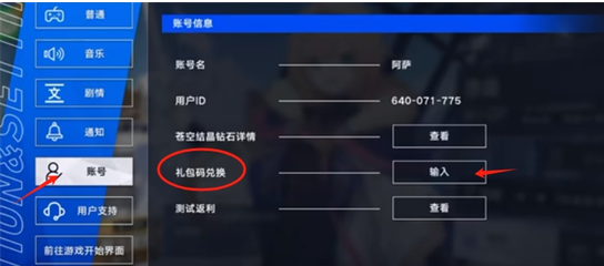 2、设置里找到账号,点击账号栏后在右侧就会有个礼包码兑换,点击输入