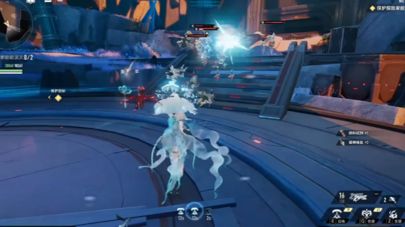 扶疏是水系阵营中极具辨识度的治疗型辅助角色,她的外观设计融合了东方古典美学与机械元素,作为精通突击枪的战术型角色,她的攻击动作精准且克制,每一次扣动扳机都伴随着细微的水纹特效,子弹命中敌人时会溅起浅蓝色水花,而非传统的硝烟效果,从视觉上强化了水元素的属性特征,扶疏的战斗核心围绕云璃这一独特的治疗单位展开,主动技能提掣浮沉释放时,会从突击枪枪口喷出两道凝结的水元素能量,落地后化作半透明的蓝色晶体状云璃,悬浮在地面上持续为周围队友输送生命值。