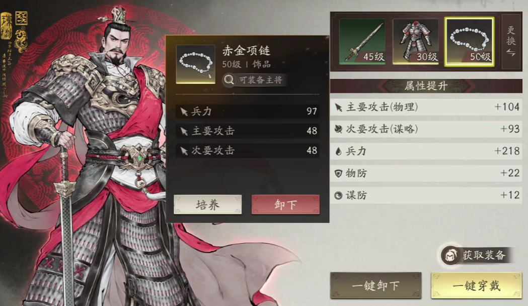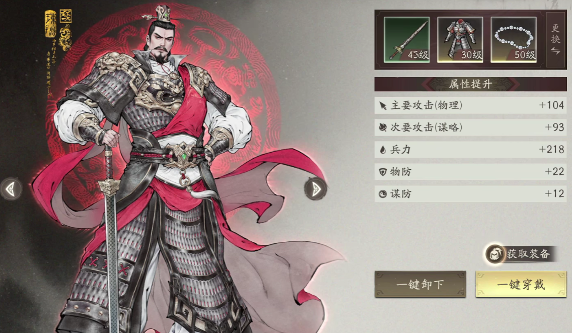 同时,游戏内也有角色的专属装备,例如关羽的青龙偃月刀,专属装备在主将持有时,不仅可以增加技能的倍率,还可以加强角色的属性值。