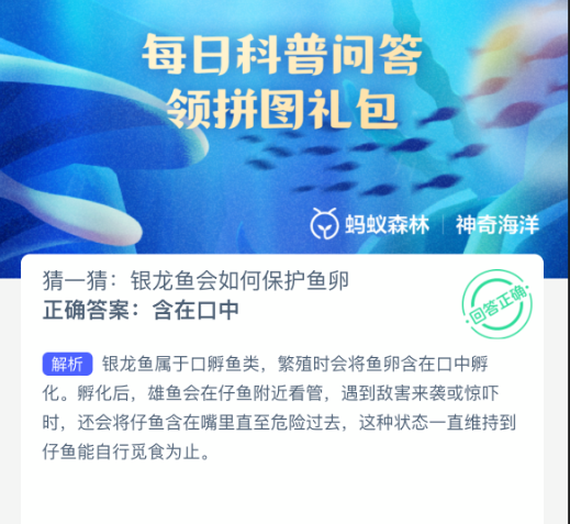 猜一猜:银龙鱼会如何保护鱼卵?【神奇海洋】11月4日新题目已开答!正确答案现已公布,点击领取拼图,一起为修复海洋生态贡献力量!今日正确答案是:【含在口中】。银龙鱼属于口孵鱼类,繁殖时会将鱼卵含在口中孵化。