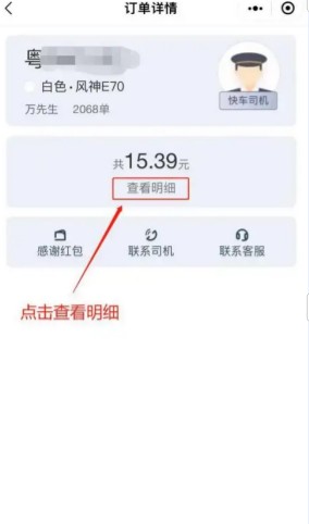 4、在”费用明细“页面可以查看该订单的起步价、里程费、时长费等订单的费用明细信息。