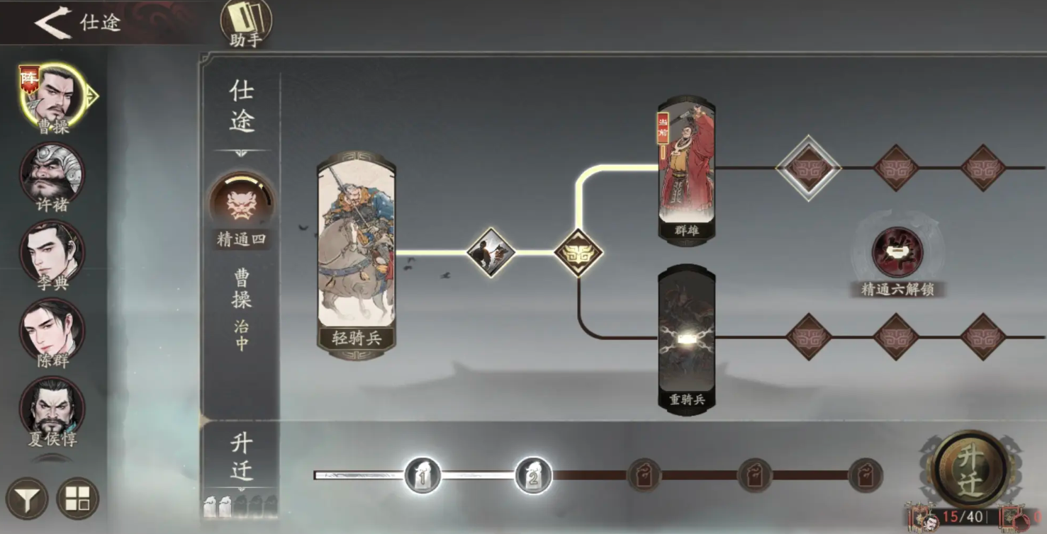 曹操作为主将单位,可以选择的统帅系路线分别是群雄和重骑兵,两个路线可以直接影响到技能的释放效果,以及曹操的射程、移动范围,当然每一个路线都可以进行分别解锁,只需要消耗指定的百钱,亦或是完成游戏当中的兵种考核,即可完成免费转职。