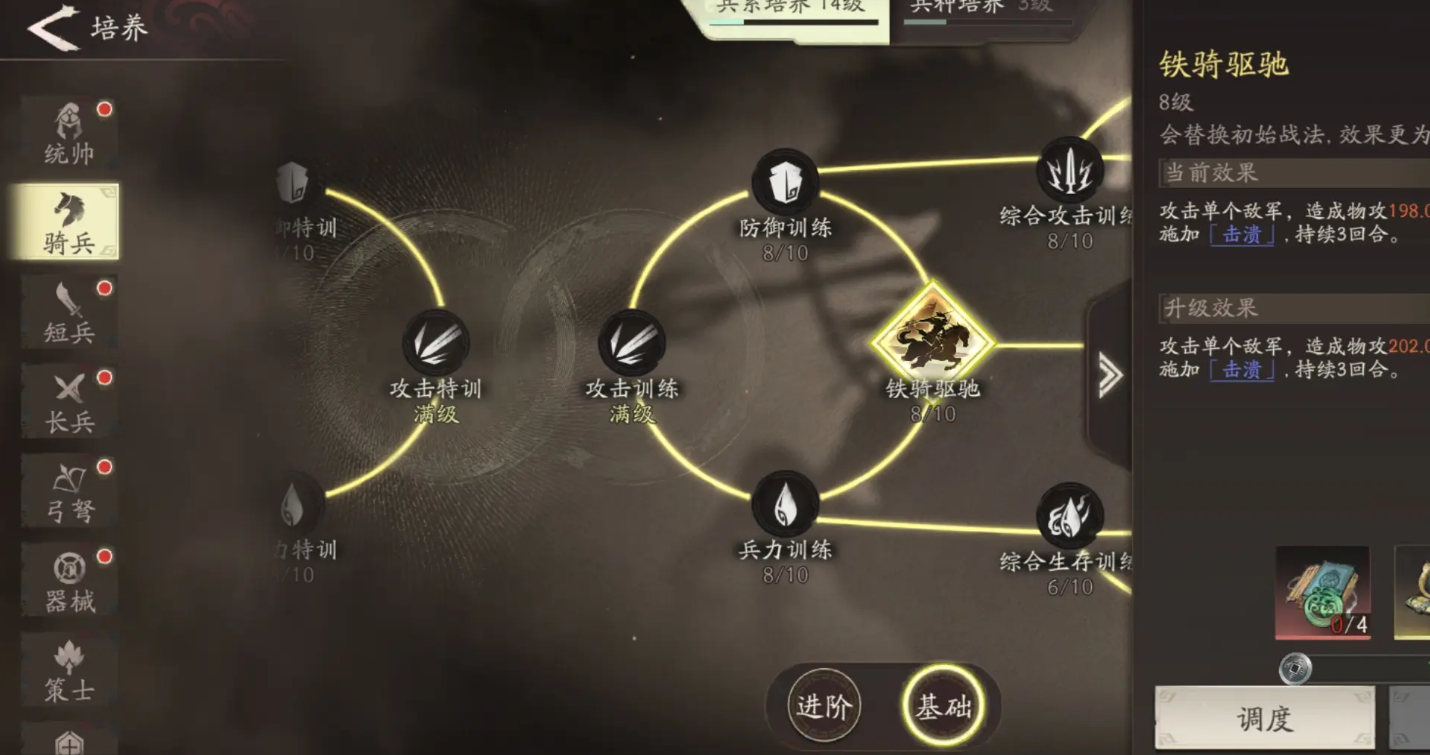 由于每一个武将的路线都可以进行解锁,倘若玩家在游戏后期的阵容发生了变化,例如玩家选择使用骑兵流派,也可以直接将曹操的授勋路线改为骑兵,同时在解锁了对应路线后,玩家也可以进一步的解锁骑兵的训练技能,例如攻击训练、防御训练、兵力训练,以及特殊技能铁骑驱驰。