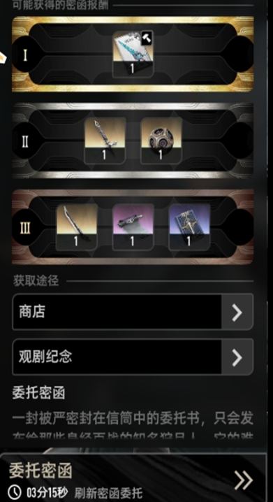 在拥有武器密函后,在委托密函里选择对应的密函即可定向刷取,此处可以看到密函通关后可能出现的3档奖励: