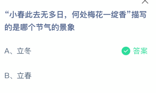 “小春此去无多日,何处梅花一绽香“描写的是哪个节气的景象?支付宝小鸡课堂开课啦!每天花一分钟答题赚饲料,喂喂小鸡就能贡献爱心啦!轻松又意义十足!2025年11月7日蚂蚁庄园的小鸡课堂题目正确答案是【立冬】,小春此去无多日何处梅花一绽香描述立冬时节的气候和景象。