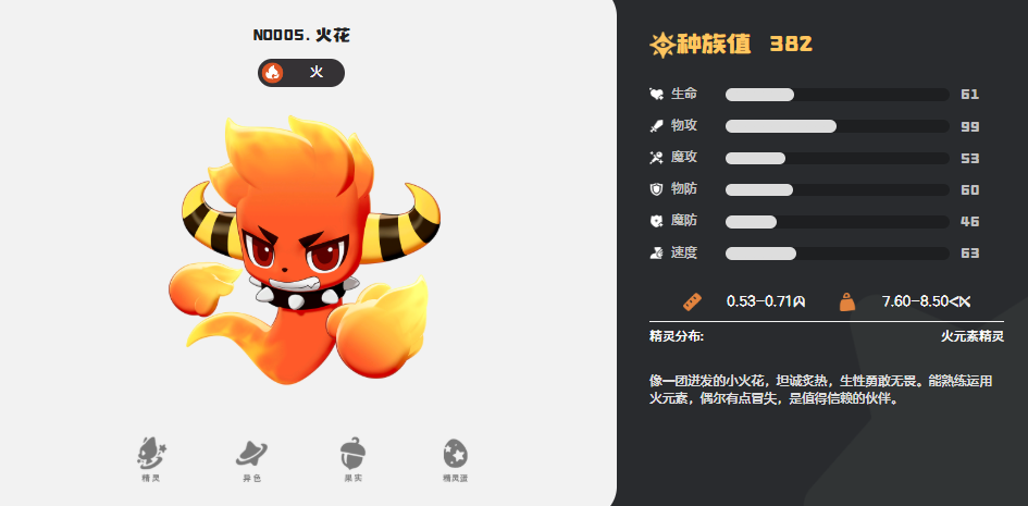 首先在三大初始精灵当中,大家可以在火花,喵喵,水蓝蓝3个精灵当中进行选择,这都是游戏系统会自动赠送给大家的,如果大家选择火花的话,最后在阵容流派上面建议大家走火系流派,因为火花也是火属性当中比较出色的一个精灵,它目前更适合的是高爆发的能力,在定位上面火花也是速攻型的角色,所以在阵容组成的情况下面,火花一般是放在主要核心位置上面的,它在技能效果上面有一个特性是带有一定的助燃机制,也就是说它释放火属性的技能的时候,它每一层可以增加助燃的状态,这里助燃的状态每一层成功施加的情况下,就能提升它15%的伤害数值。