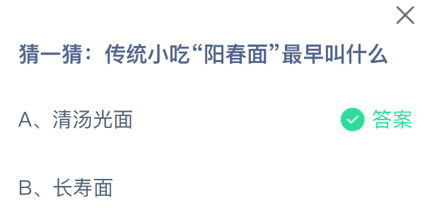 猜一猜:传统小吃“阳春面”最早叫什么?支付宝小鸡课堂开课啦!每天花一分钟答题赚饲料,喂喂小鸡就能贡献爱心啦!轻松又意义十足!2025年11月11日蚂蚁庄园的小鸡课堂题目正确答案是【清汤光面】,阳春面是上海最大众化的面点,本来的名字叫“清汤光面”。