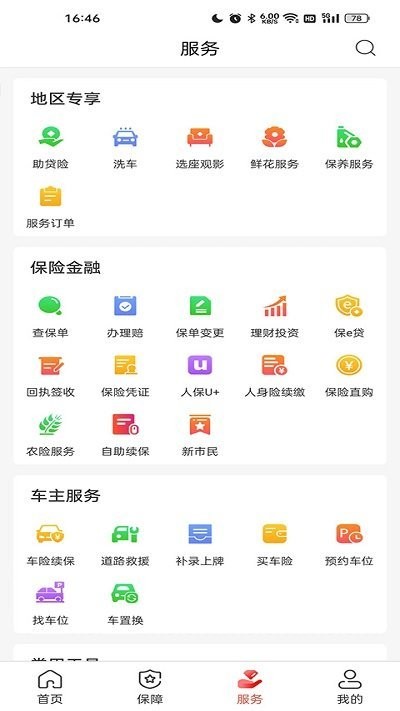 3、服务:提供地区专享、保险金融、车主服务、常用工具、大众生活、就诊服务、健康管理、养老金专区等服务