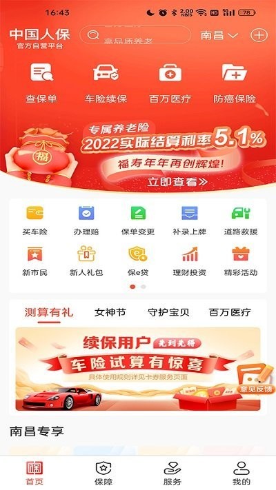 1、首页:支持查保单、百万医疗购买、车险续保、防癌保险购买等多种服务功能