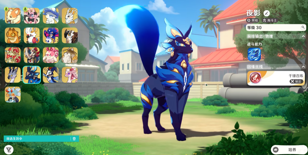 夜影它在外观上看起来是非常像一只大尾巴狐狸的,但是整体的颜色外观上面是采用了蓝紫色还有灰色相间的设定,而且在它的外观设计上看起来是非常高贵的,这个夜影目前在游戏当中是黑暗元理当中的精灵,它的特性效果是角斗士,目前如果大家用它的话,其实是比较适合放在前排来输出的,因为它带来的战斗能力上面大部分都是物理攻击的效果,所以需要配队的时候自身的定位以及羁绊效果最好是都触发足够的加成。