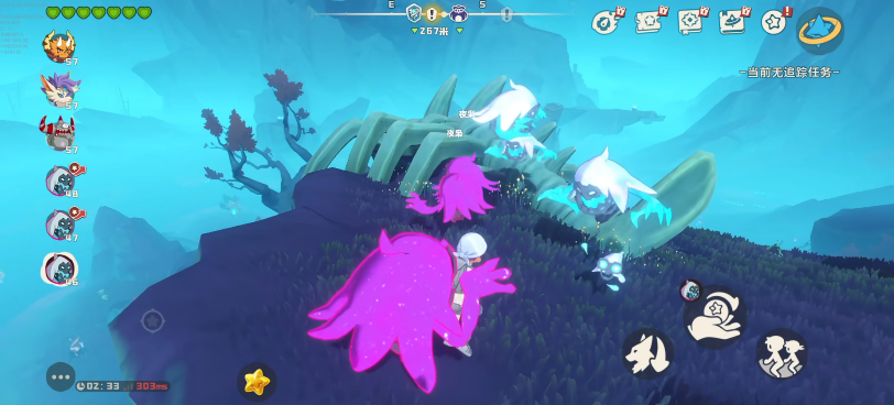 以夜枭为例,它的常规出没地点为黑水崖。正常状态下为蓝白配色,而当出现通体紫色的个体时,靠近后周围环境会随之变化,天空转为暗紫色,并自动进入战斗环节。这正是噩梦形态的显著特征之一。