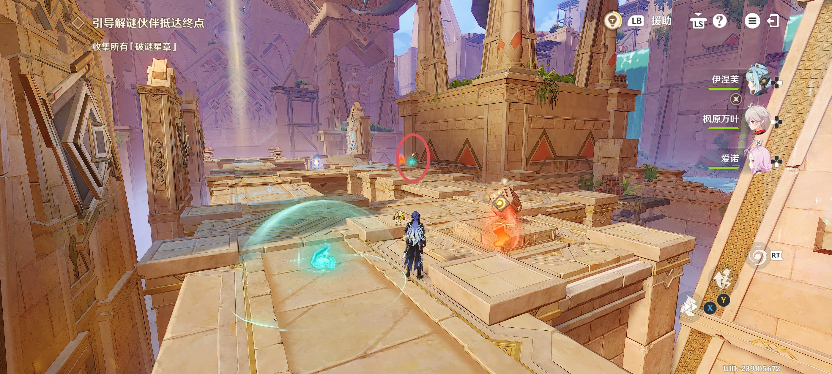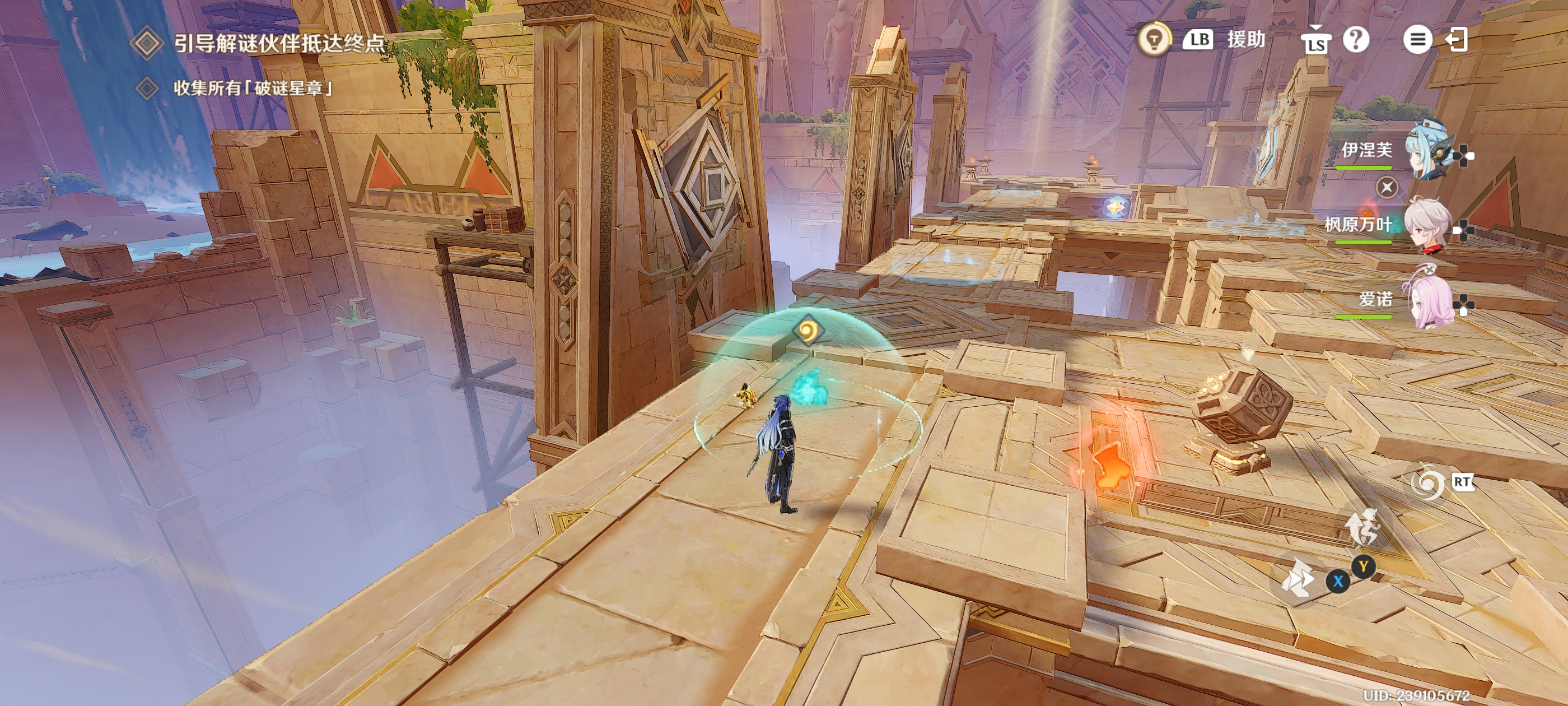施放战技将[升腾奇效]拾取后放置在基座上,当解谜伙伴经过时将使自身被高高弹起;