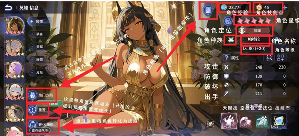 3、角色立绘左下角从上往依次是【热门方案】(在这个页面你可以查看其他用户上传的方案并引用)、【重置】(角色处于非派遣、非锁定、非在编队时,可将角色所有的养成资源返还,如果角色升阶了,升阶所花费的角色会退成角色卡退回到背包里面,是100%重置且免费的,不要担心前期的资源消耗。)、【转化技能】(角色处于非派遣、非锁定、非在编队、非升阶时,可消耗该角色将角色转化为可装配技能)