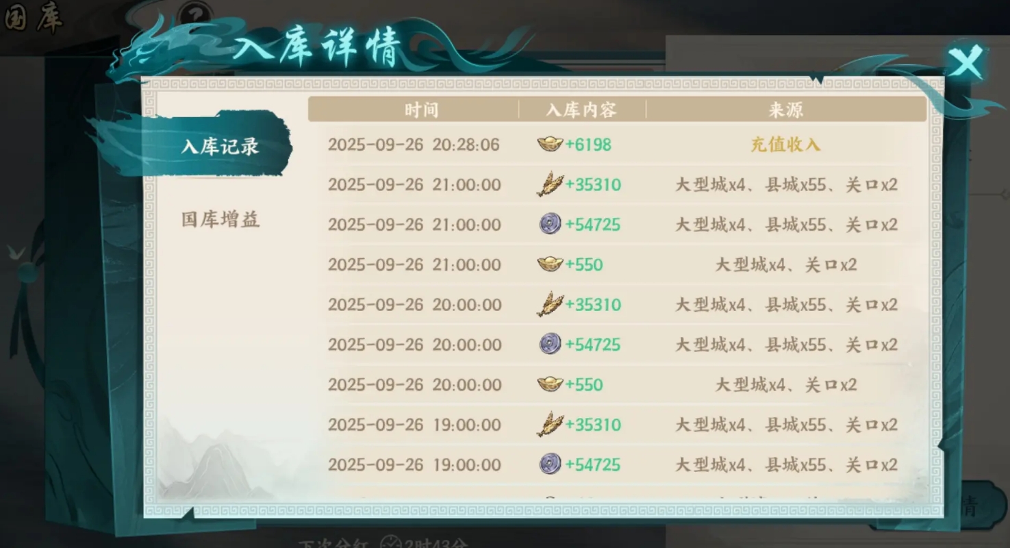 除了分红比例会影响玩家们在分红时所能获得的资源数量外,国库库存也会影响最终的分红结果,如果国库里的物资数量越多,那分红时各位能拿到的资源就越多,反之则会变得非常少。国库库存的物资数量主要与玩家们在游戏中的行为有关,玩家们可通过占领大型城池、县城、关口等要地,来提高国库里的粮食与钱币库存,且提升量与所占据的要地数量呈正比。而元宝的库存累积则需要通过玩家充值,只要自己所属的国家里有玩家氪金,游戏就会根据氪金比例将一定数量的元宝放入国库。要想了解国库各资源的增加情况,各位可通过查看国库的入库详情。