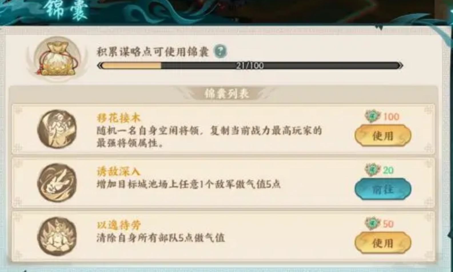 每次完成与敌人的作战或是成功解决所刷出来的事件后,各位还能获得谋略点奖励。玩家可使用谋略点在锦囊界面中激活不同的阵营效果,来为阵营里的全体玩家提供大量的增益,提高他们的作战效率。待跨服军演活动结束后,游戏会统一为所有阵营计算所得的积分,并根据积分确定各阵营的排名和发放排名奖励(以及个人奖励)。个人奖励中,除了必然会获得的军演币外,表现出色的玩家还能拿到军神称号以及更多的宝箱,阵营奖励则是会给予玩家丰厚的元宝奖励,