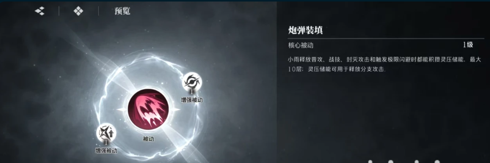 䌷屋雨的核心被动技能名为炮弹装填,这是一个能够让她快速储藏灵压的技能,不管是使用普攻还是战技、封灭技亦或者是闪避都能够积攒灵压,最大能够叠加到10层,灵压可以用来使用分支攻击,另外两个被动名字均为增强被动,这两个增强位置主要是提升䌷屋雨的灵系伤害,降低敌人的攻击和移动的速度,注意该效果只能在敌人进入到火焰区域内被触发。