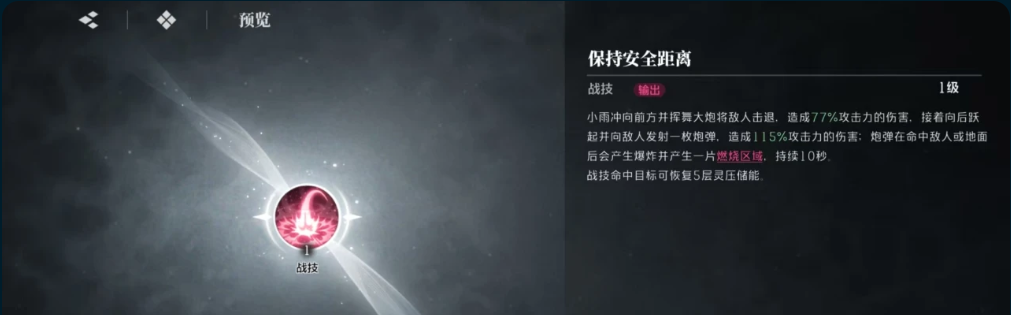 保持安全距离这个战技是一个输出型的技能,小雨在扛着大炮冲向前方的敌人并且使用大炮将敌人给击退时,能够造成77%的伤害,之后还会直接跳起来对敌人所在的方向发射出一枚炮弹,能够在给敌人造成115%的伤害,炮弹落地或者是击中敌人以后还会自动爆炸,产生一片燃烧区域。
