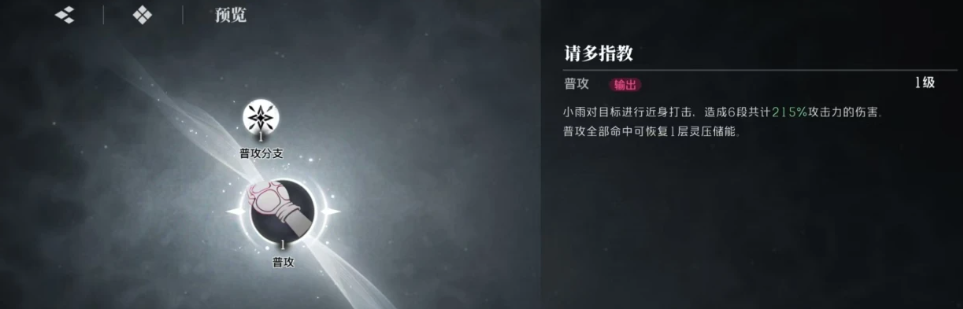 普攻技能请多指教是一个直接能够用近身攻击给敌人造成6段式的伤害,6段伤害一共能够造成215%的伤害,且普攻若是全都把敌人给击中的话还能够回复1层的灵压储能,封灭技能则是直接对敌人发射炮弹攻击对方,炮弹命中后在造成伤害时还附带有击飞的效果,在敌人的脚下还会自动出现燃烧区域,如果是在反击的时候把敌人给击中的话,那灵压储能就可以恢复5层。