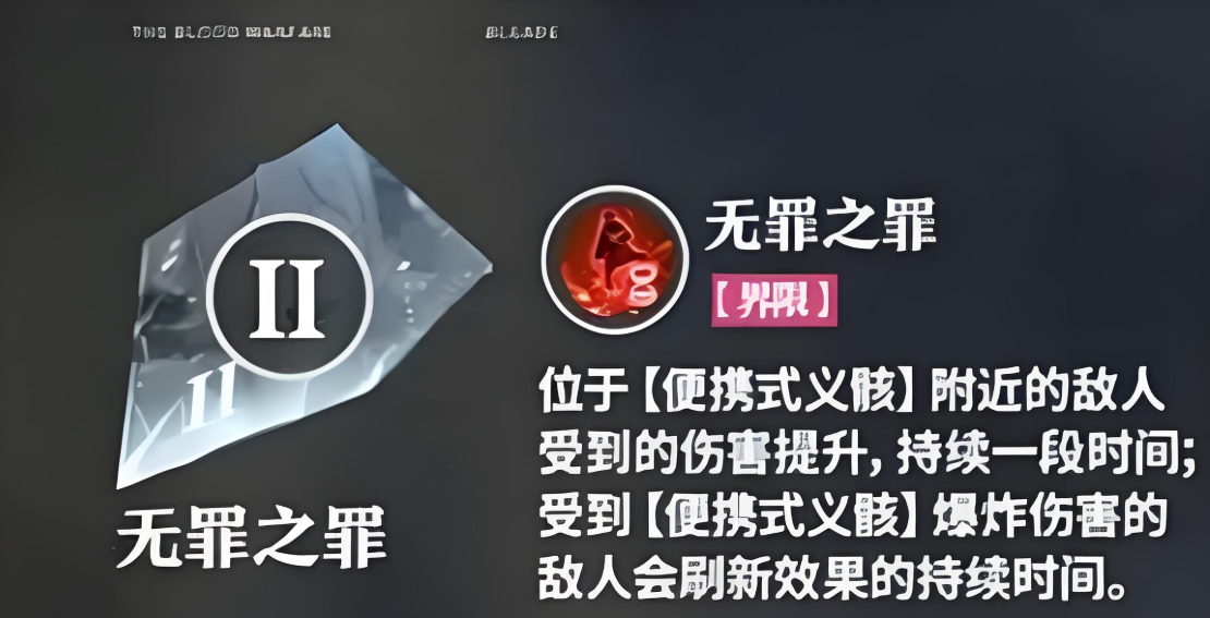 无罪之罪是店长的第二个界限技能,当店长的位置和便携式义骸附近的敌人距离非常近的时候,该技能使用以后能够使敌人所受到的伤害得到提升而且受到的伤害还会持续一段时间,若是敌人在本次攻击中受到了伤害的话,那敌人的负面状态时间则会出现延长。