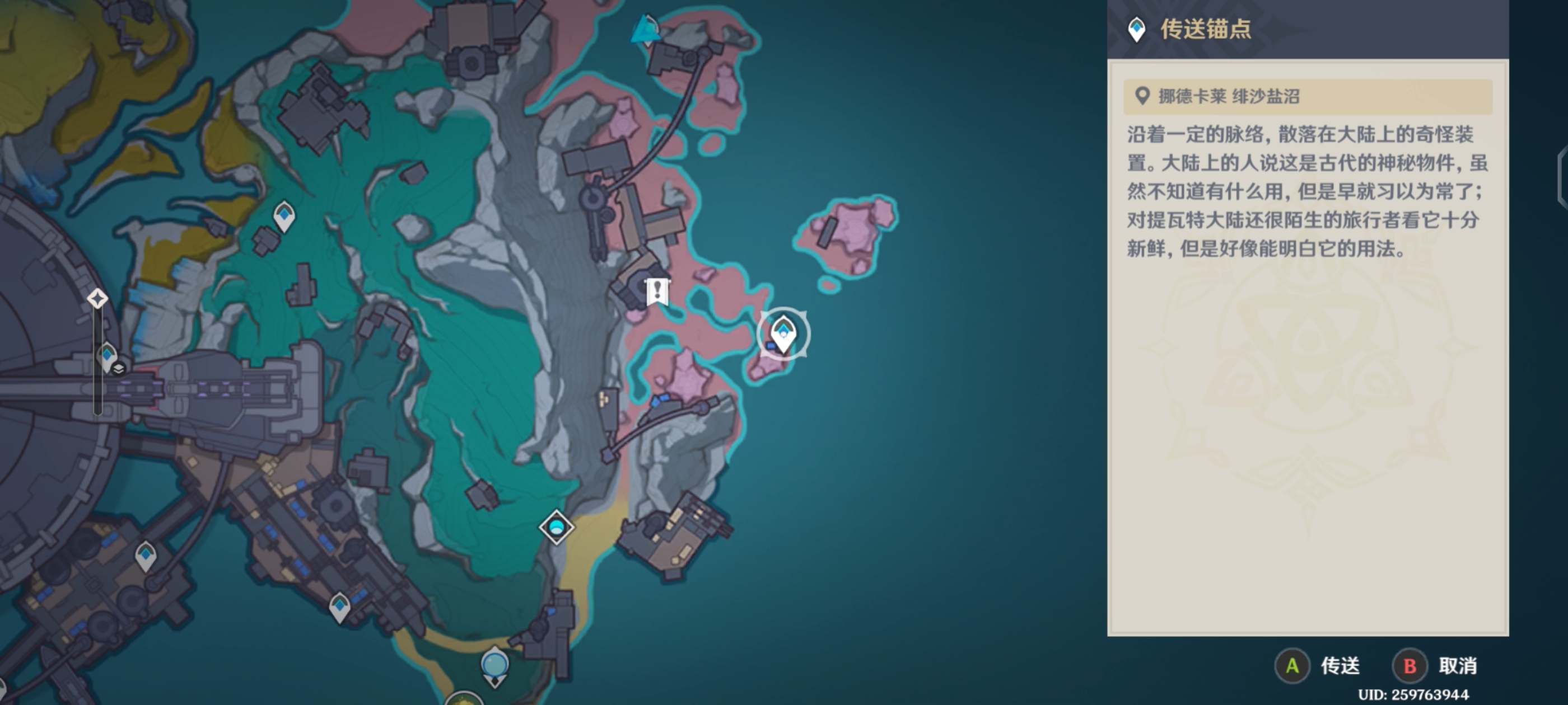 来到[挪德卡莱-月矩力试验设计局]右边的[绯沙盐沼];