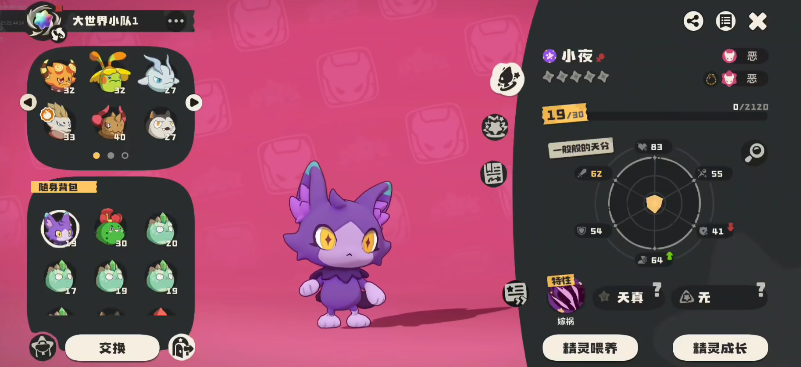 初始形态名为小夜,外形是一只紫色毛发、长有恶魔尾巴的小猫,总种族值为322。虽然基础数值不算顶尖,但其自带被动技能“嫁祸”,可免疫首次受到的伤害,极大提升生存能力。此外,它还能模拟小洛克的外形进行隐藏,迷惑对手,是游戏中少见的具备拟态机制的精灵,需进入限定秘境才能捕捉。