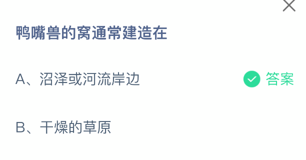 鸭嘴兽的窝通常建造在?支付宝小鸡课堂开课啦!每天花一分钟答题赚饲料,喂喂小鸡就能贡献爱心啦!轻松又意义十足!2025年11月15日蚂蚁庄园的小鸡课堂题目正确答案是【沼泽或河流岸边】,鸭嘴兽的窝通常建造在沼泽或河流的岸边,洞口开在水下,包括山涧、死水或污浊的河流、湖泊和池塘。