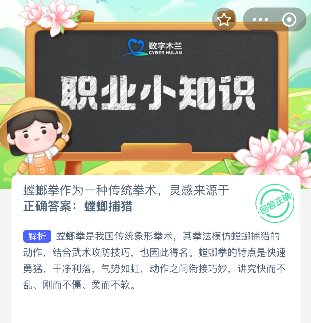螳螂拳作为一种传统拳术,灵感来源于哪里?【蚂蚁新村每日一题】2025年11月18日题目已发布!坚持答题,积累木兰币,即可加速小镇建设。答对本题,立即可享“产速+3/时”的加速奖励!今天正确答案是【螳螂捕猎】。螳螂拳是我国传统象形拳术,其拳法模仿螳螂捕猎的动作,结合武术攻防技巧,也因此得名。