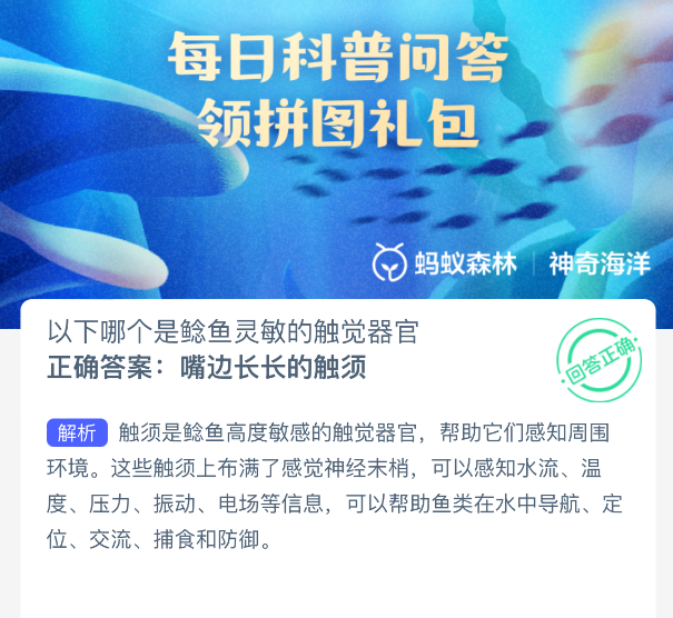以下哪个是鲶鱼灵敏的触觉器官?【神奇海洋】11月18日新题目已开答!正确答案现已公布,点击领取拼图,一起为修复海洋生态贡献力量!今日正确答案是:【嘴边长长的触须】。触须是鲶鱼高度敏感的触觉器官,帮助它们感知周围环境。