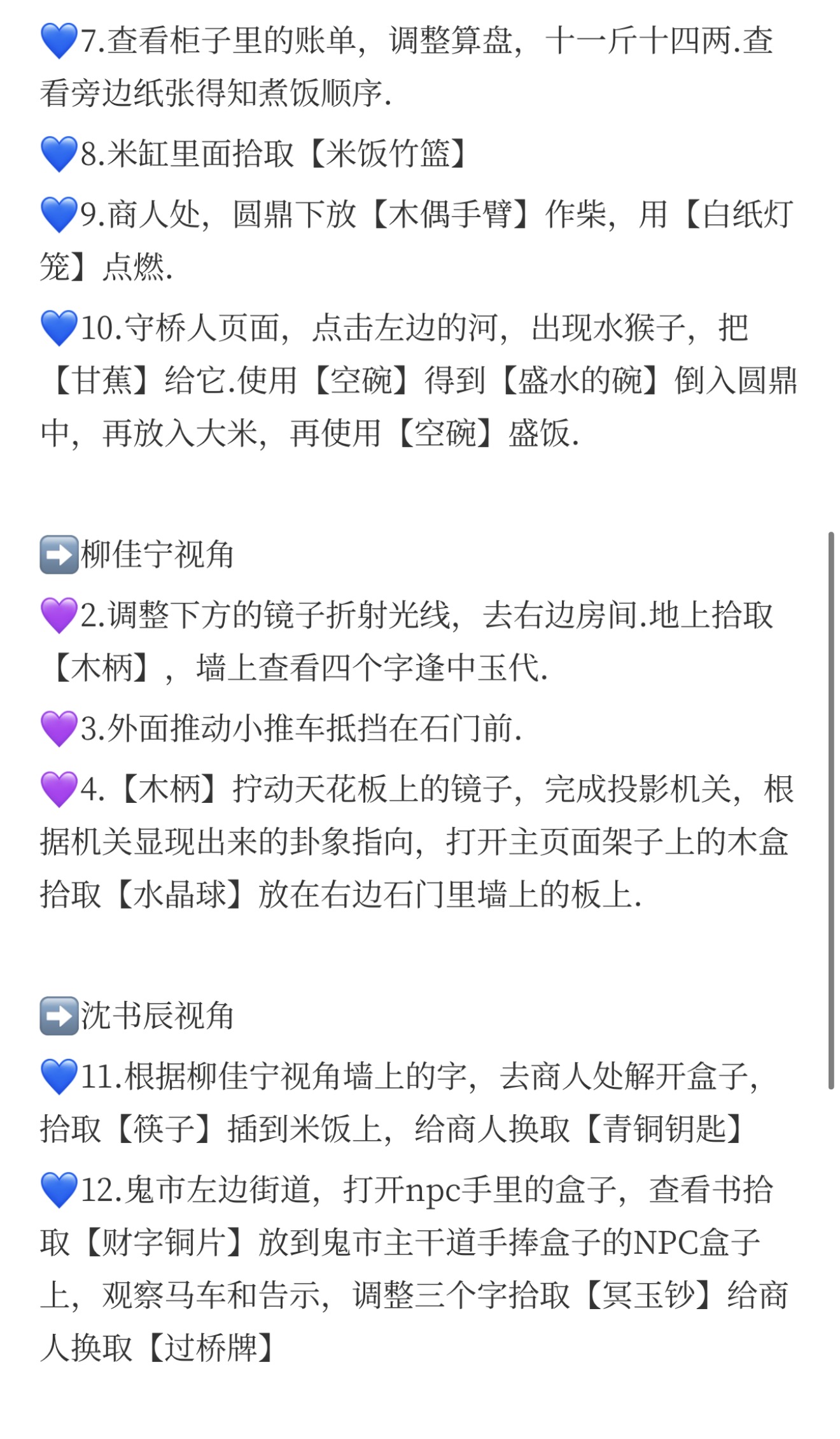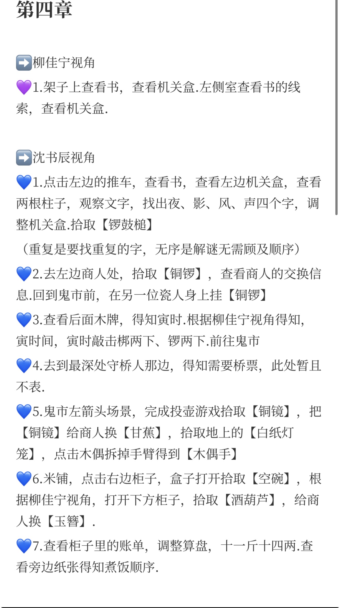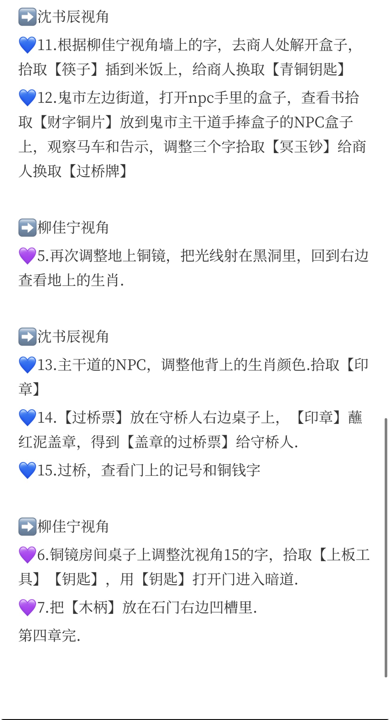 《缠重山2冥玉钞》第四章通关攻略来了:第四章需双视角切换解谜。沈书辰在鬼市通过投壶、交易获取过桥票,并依据柳佳宁处的线索“逢中玉代”解开商人盒子。柳佳宁则通过调整镜面折射破解机关,双方协作完成生肖颜色对照与过桥手续,最终开启暗道。