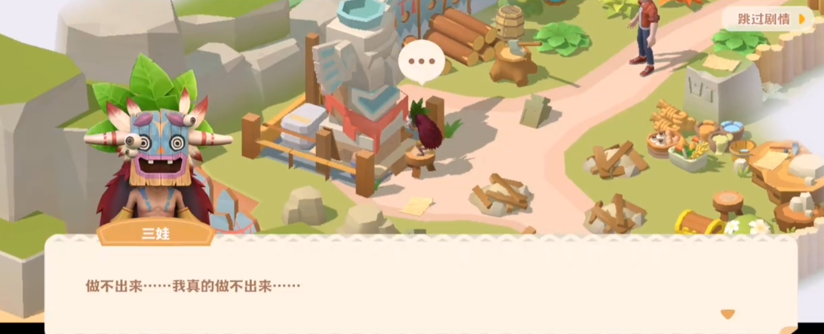 在帮助妮娜建完房子之后,我们会来到一处奇怪的土著雕像旁边,我们会看到三名土著人在雕像旁边,我们与之对话,能了解到他们是想要完成雕像,需要收集木料木材来建造雕像。我们去旁边地上类似废墟的地方,会发现有“收集”的选项,在获得总共60块木头之后,我们便可以帮助这些土著建造完雕像,它们也就会顺势加入我们。