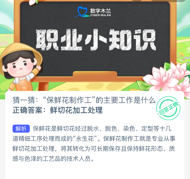 以上就是猜一猜:“保鲜花制作工”的主要工作是什么?支付宝蚂蚁新村最新答案2025年11月21日,更多精彩内容,请点击关注3DM手游网更新!