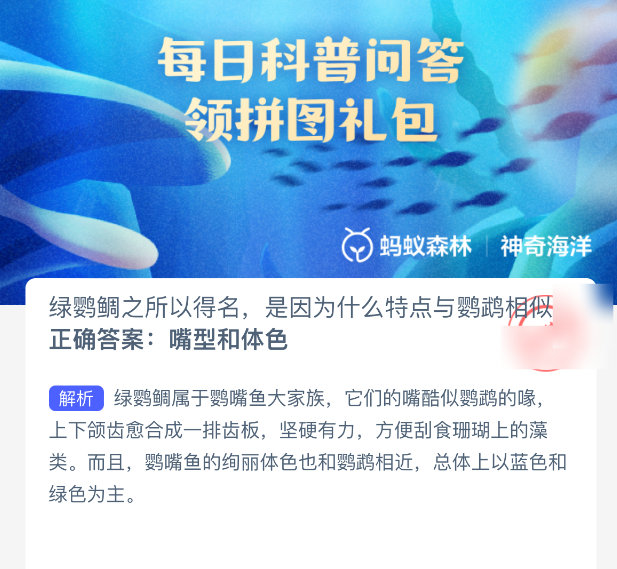 绿鹦鲷之所以得名是因为什么特点与鹦鹉相似?【神奇海洋】11月21日新题目已开答!正确答案现已公布,点击领取拼图,一起为修复海洋生态贡献力量!今日正确答案是:【嘴型和体色】。绿鹦鲷之所以得名是因为嘴型和体色与鹦鹉相似.